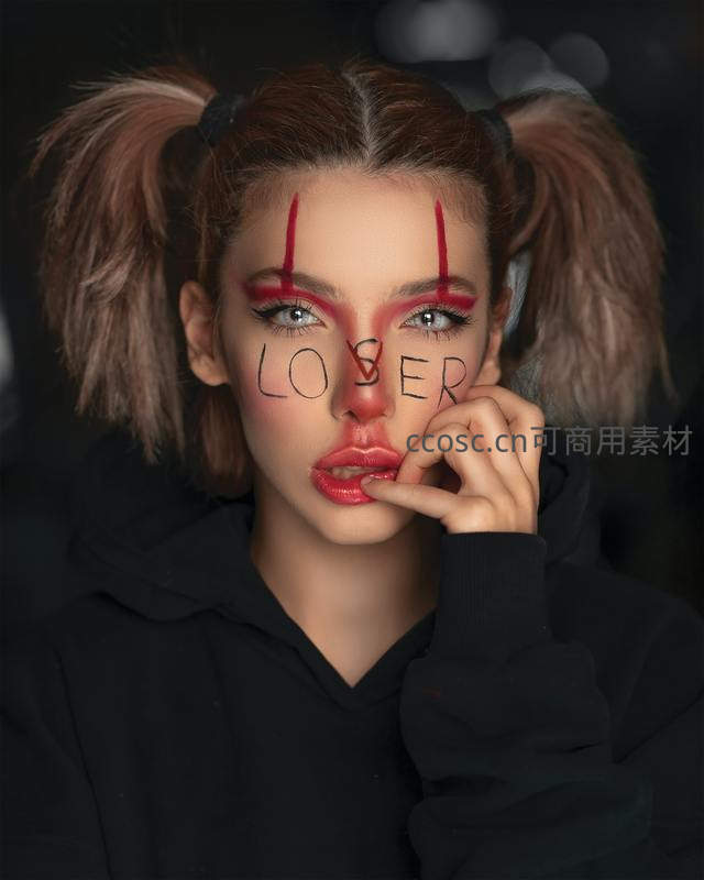 一位年轻女性以创意妆容示人,脸上用红色颜料书写“LOSER”字样,搭配双马尾和深色卫衣,展现叛逆与自我表达的艺术风格。