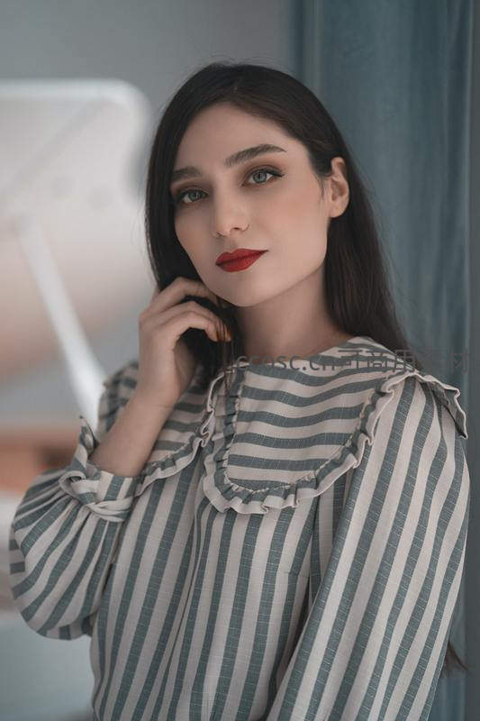 身穿蓝白条纹荷叶边衬衫的女子,涂着鲜艳红唇,手轻抚发丝,眼神温柔,营造出清新又略带复古的生活氛围。