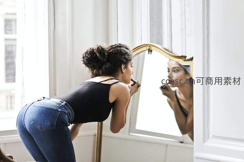 一位卷发女性俯身于古典金色镜框前,专注涂抹口红,窗外自然光洒落,映衬出日常生活中精致而惬意的时刻。