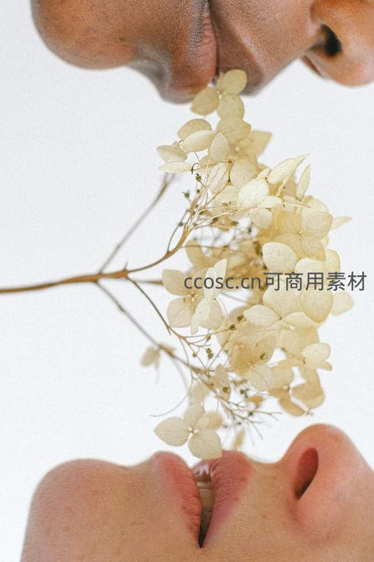 两张人脸从上下两侧靠近,中间夹着一束洁白干花,构图极具创意,传递温柔、亲密与诗意的情感氛围,适合艺术或婚礼主题使用。