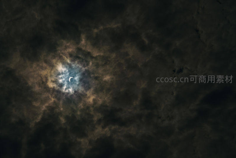 一弯新月从厚重的云层中透出微光,营造出深邃而静谧的夜间氛围,令人沉醉于宇宙的浩瀚与神秘。
