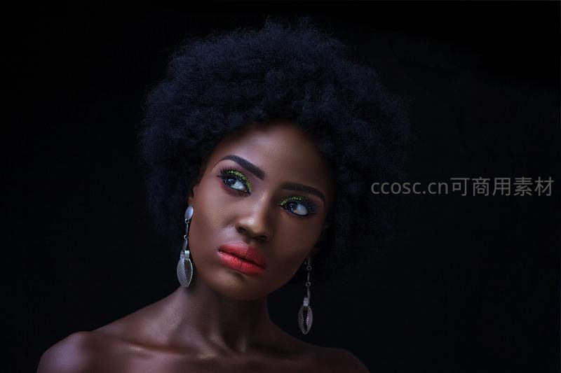 深色皮肤女性佩戴银色耳饰,搭配亮眼绿色眼影与鲜红唇色,在纯黑背景下凸显面部轮廓与妆容色彩,充满艺术感与力量感。