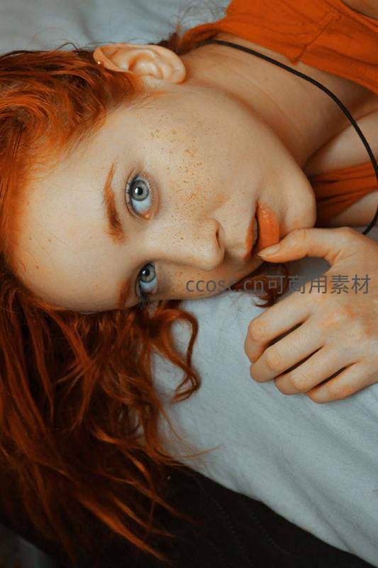 一位拥有鲜艳红发和清澈蓝眸的年轻女性,脸上点缀着自然的雀斑,她慵懒地侧卧着,眼神直视镜头,充满个性与魅力。