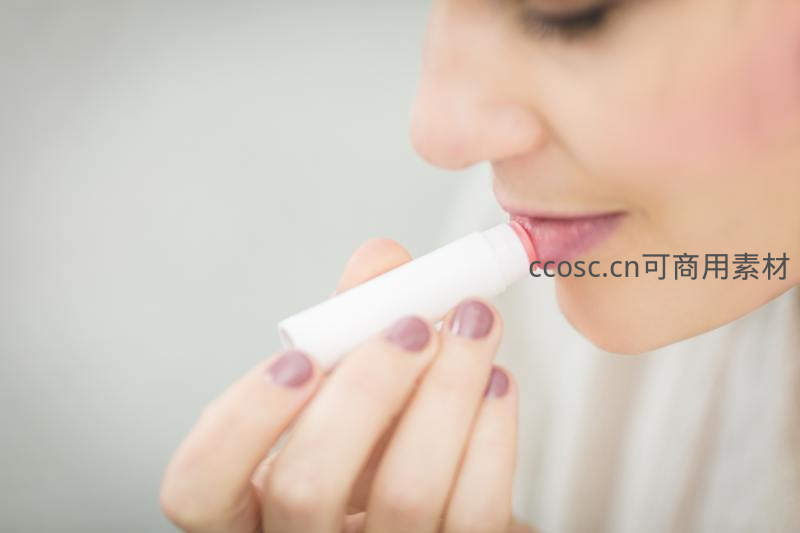 一位女性正用指尖轻柔地为双唇涂抹润唇膏,淡紫色美甲与柔和的光线相得益彰,捕捉了日常生活中一个温柔而精致的护肤瞬间。
