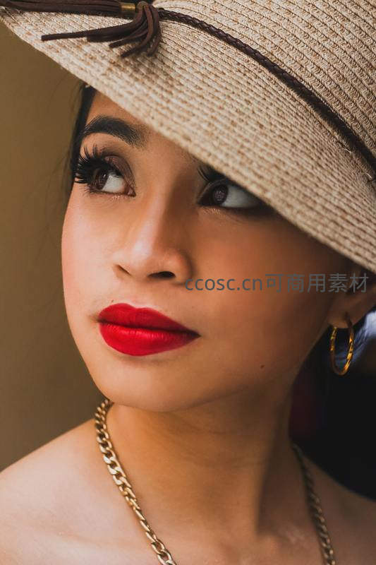 戴草帽红唇女性侧颜