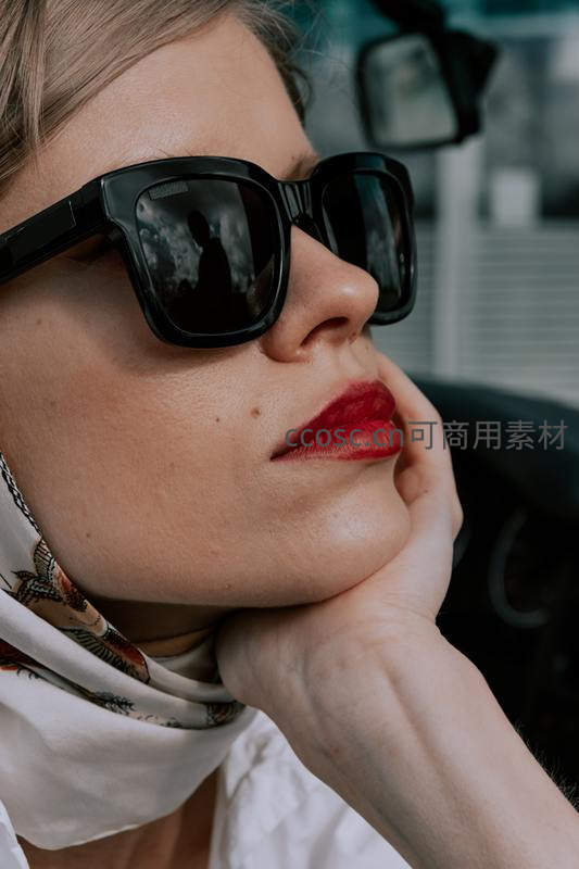 车内戴墨镜女子红唇沉思特写