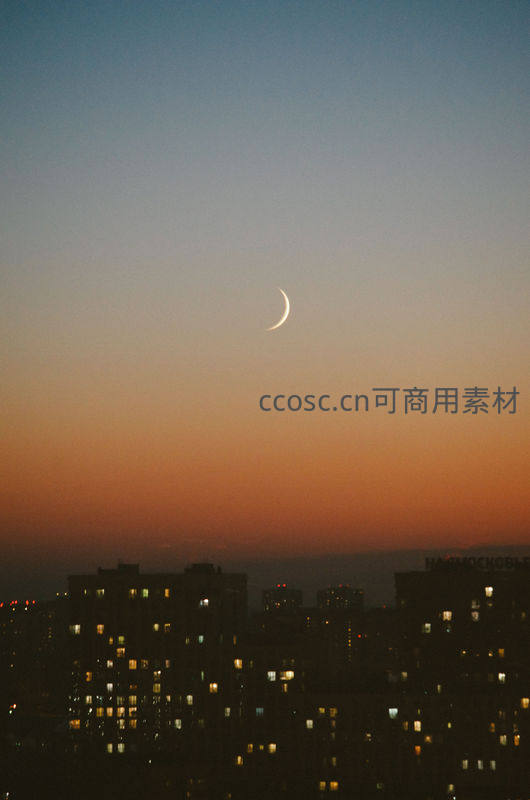 夕阳余晖染红天际,一弯新月悄然升起,俯瞰万家灯火的城市,展现现代都市的温柔与静谧。