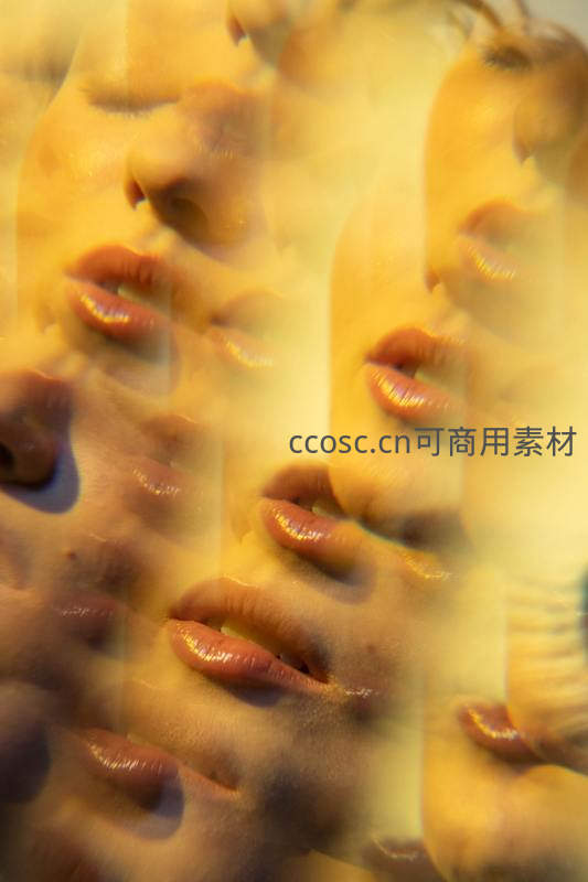 通过多重曝光技术叠加多张人脸局部,突出闪亮红唇在暖黄光影中的流动感,营造出迷幻、梦幻且富有艺术表现力的画面。