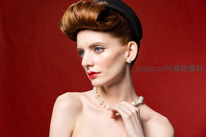 模特身着复古造型,佩戴珍珠项链与贝雷帽,红唇与背景呼应,尽显经典优雅与时尚魅力。