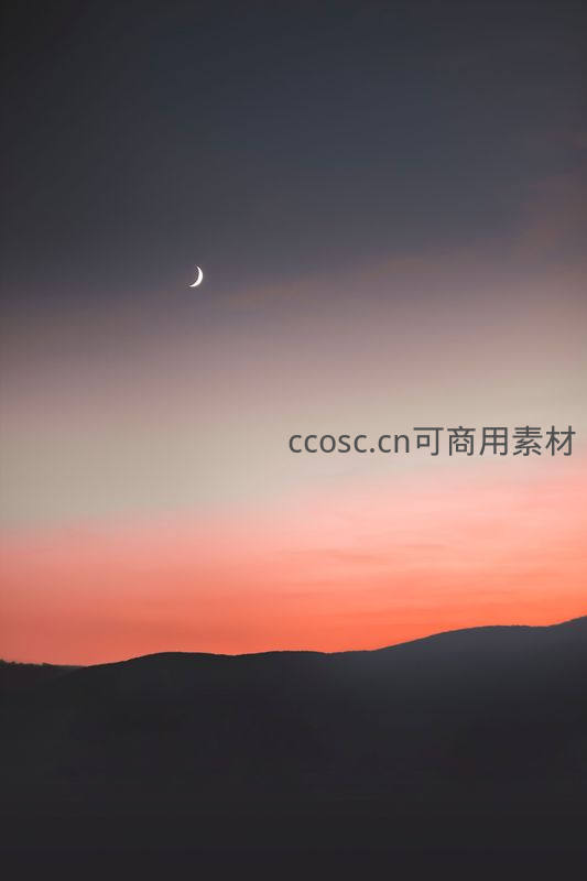 橙红色的晚霞铺满天际,远山如墨,一弯新月高悬,勾勒出天地间最壮丽而宁静的自然交响。