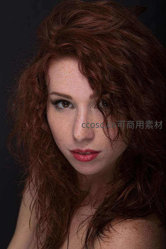 一位拥有浓密红发和可爱雀斑的年轻女性,在深色背景下直视镜头,展现出自信与自然的美感。
