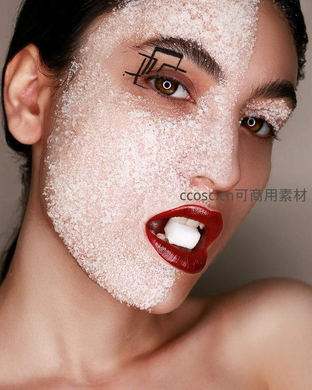 模特面部覆盖白色糖霜颗粒,搭配几何线条眼妆与鲜红唇色,嘴里含着方糖,极具视觉冲击力的艺术创意妆容,展现大胆前卫的美学风格。