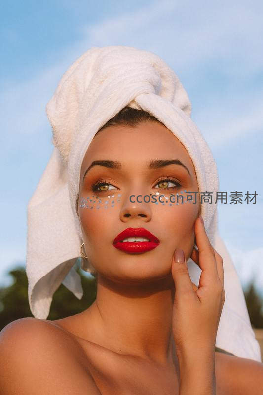 一位女性用白色毛巾包裹头发,脸上点缀着闪亮星钻贴纸,涂着鲜艳红唇,在户外阳光下展现精致妆容与自信神态。