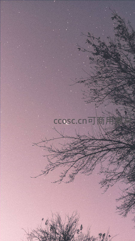 柔和的紫粉色调夜空中,新月与点点繁星相伴,枝桠伸展如画框,构建出一个温柔梦幻的夜晚童话世界。