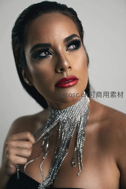 一位女性模特以精致妆容和闪亮银色流苏颈饰亮相,红唇与深邃眼妆相得益彰,散发高贵典雅的时尚气息。