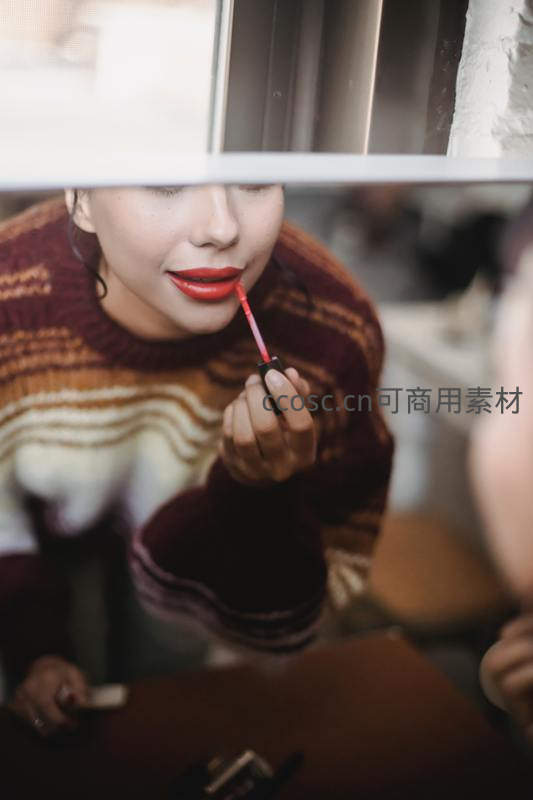 身穿条纹毛衣的年轻女子在窗边对着镜子仔细涂抹红色唇彩,柔和光线映衬温馨日常,充满生活气息。