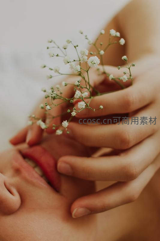 一双纤细的手捧着一束洁白的满天星,轻轻覆在闭目微笑的脸颊上,画面充满爱意与宁静,传递出细腻温柔的情感氛围。