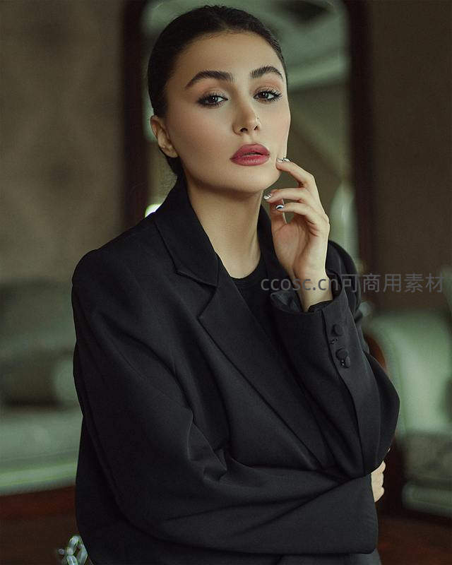 一位穿着黑色西装外套的女性在柔和室内光线下凝视镜头,手轻触脸颊,妆容精致,散发出冷静而优雅的气质。