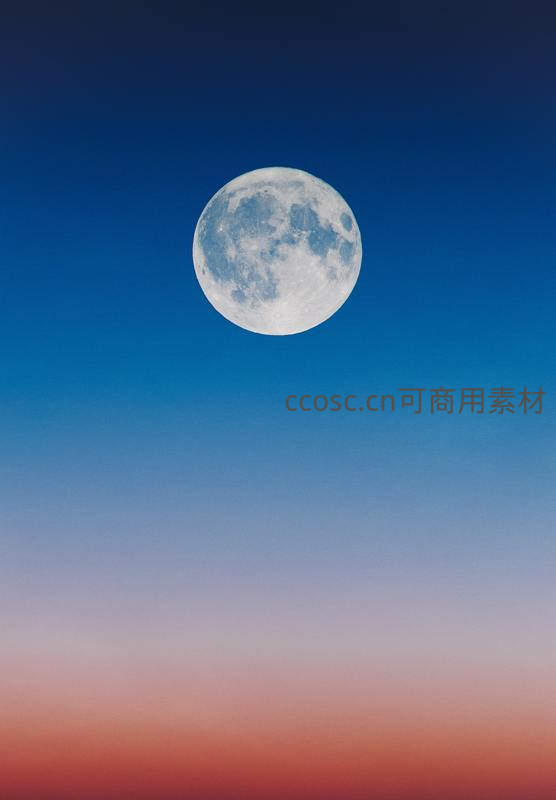一轮清晰的满月悬挂于从蓝色过渡到橙红的纯净天空中,展现天地间的和谐之美。