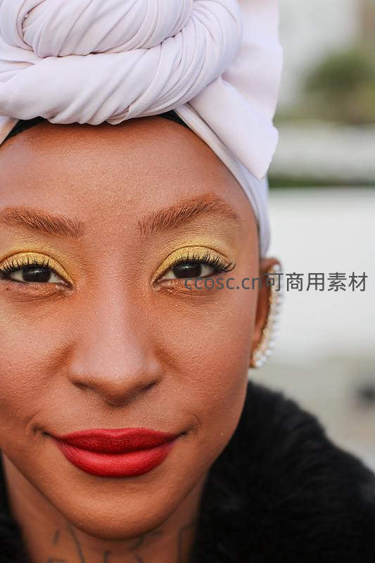 一位佩戴白色头巾的女性面带微笑,金色眼影与红唇相得益彰,珍珠耳环点缀优雅气质,展现多元文化下的时尚美妆风格。