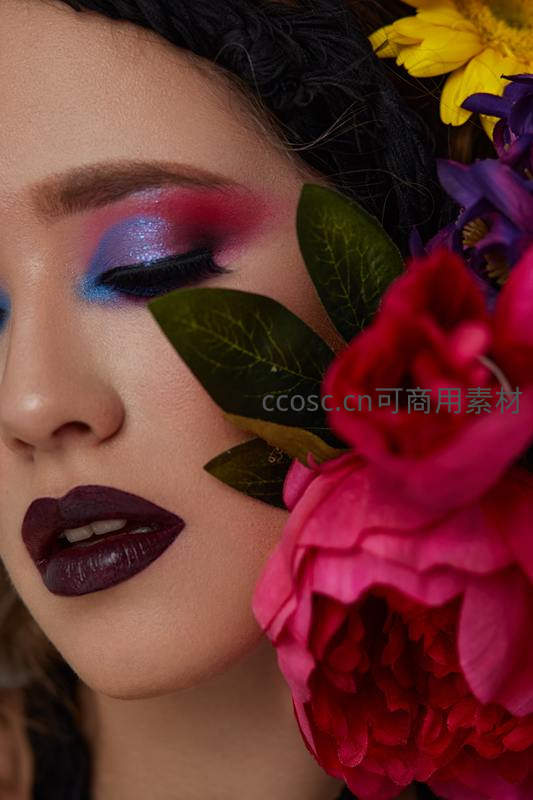 色彩斑斓的眼影与鲜艳花卉相映成趣,模特闭目沉醉于自然之美,绿叶点缀其间,营造出如梦似幻的视觉享受。