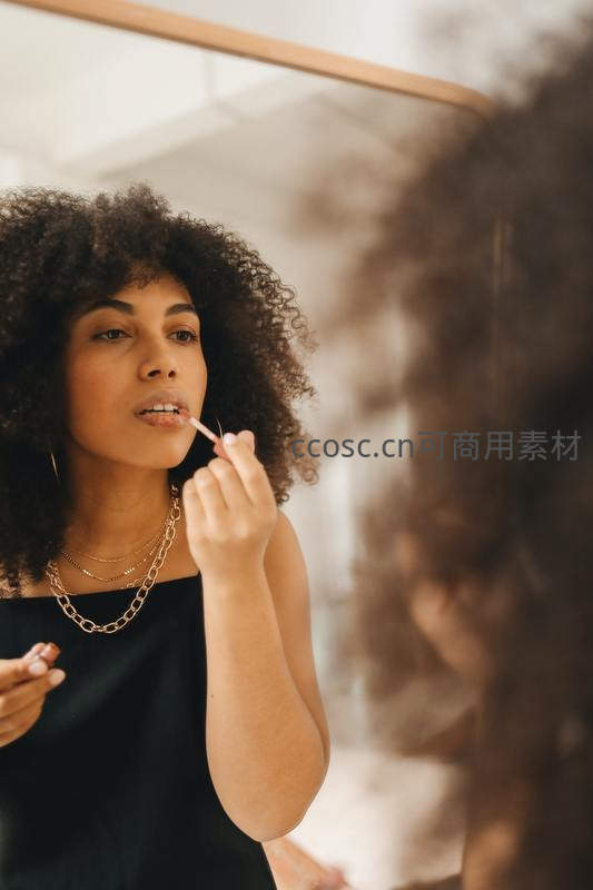 一位拥有蓬松卷发的女性正对着镜子仔细涂抹唇彩,神情专注,展现了日常美妆中的精致与自信。