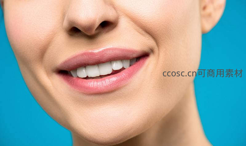 明亮的蓝色背景下,女性嘴角上扬露出整齐洁白的牙齿,唇色自然水润,传递出健康、自信与活力的感觉。