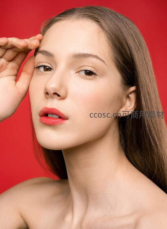 年轻女子在纯红背景下优雅侧颜凝视,妆容精致,红唇点睛,手轻触额头,展现出温柔而时尚的现代女性魅力。