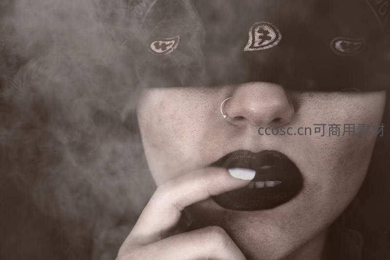 女性面部被烟雾与图案遮挡,仅露鼻环与深色唇妆,手轻触唇边,整体氛围神秘冷峻,展现强烈的个人风格与情绪张力。
