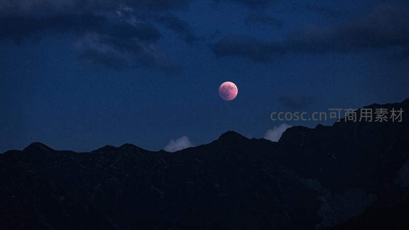 一轮柔和的粉红色满月从深蓝色的夜空中升起,悬于黑色剪影般的山峦之上,为寂静的夜晚增添了一抹温柔而神秘的色彩。