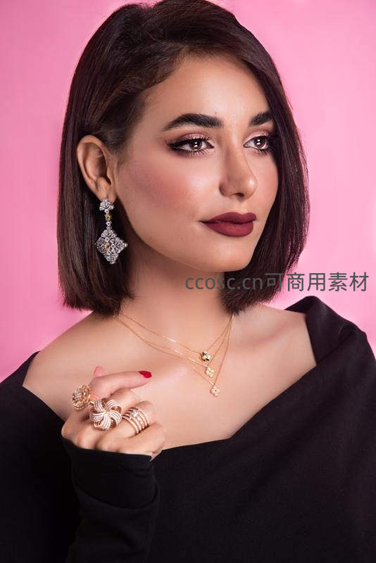 深色短发女性身着黑色上衣,在粉色背景下展示多件精致珠宝,妆容优雅,散发高贵与现代时尚魅力。