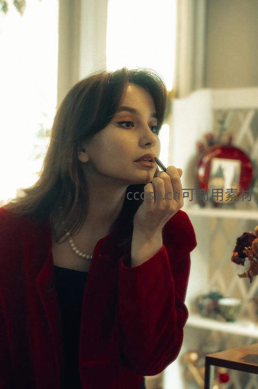 女子穿着红色丝绒外套,在窗边用口红仔细描绘唇形,柔和阳光洒落,营造温馨而专注的日常美妆场景。