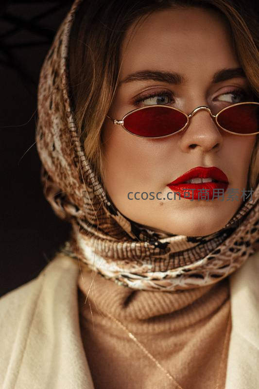 模特佩戴着豹纹丝巾和红色椭圆墨镜,搭配鲜艳的红唇,营造出浓郁的复古摩登氛围,展现了独特的个人风格与时尚魅力。
