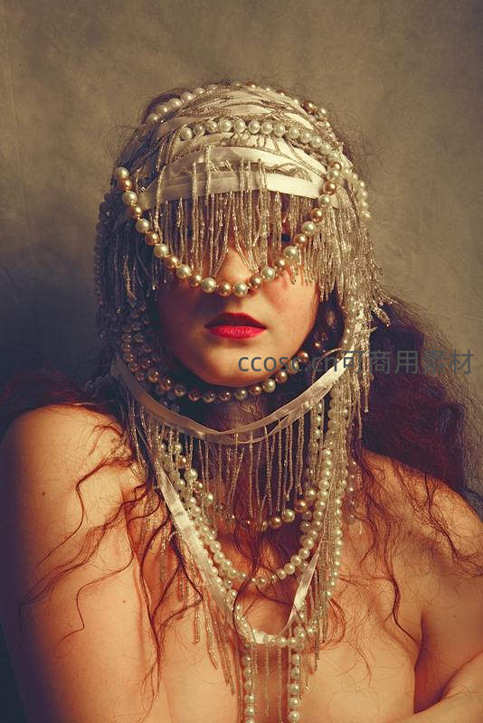 一位女性被大量珍珠和流苏组成的面纱遮住双眼,仅露出红唇和部分面容,创造出强烈的视觉冲击力和神秘的艺术美感。
