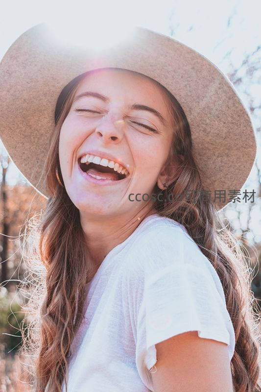 一位戴着宽檐帽的女子在明媚阳光下闭眼大笑,长发随风轻扬,展现出无拘无束的快乐与享受自然的惬意时光。