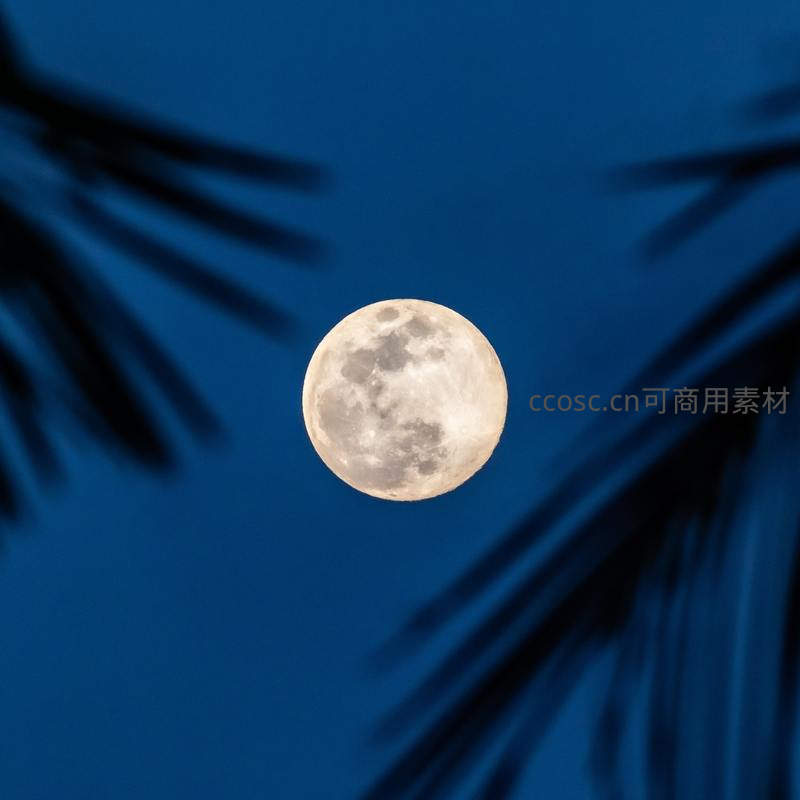 满月透过棕榈叶的静谧夜空
