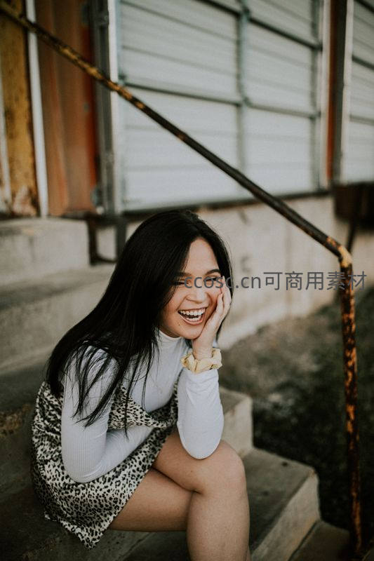 一位黑发女孩坐在略显斑驳的水泥台阶上,身穿豹纹短裙和白色内搭,用手托着脸颊,仰头开怀大笑,背景是锈迹斑斑的栏杆和卷帘门,充满随性与活力。