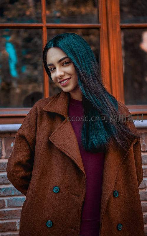 一位拥有独特蓝绿色长发的年轻女性,身穿棕色大衣,在复古砖墙与木窗前绽放温暖笑容,展现青春活力与时尚感。