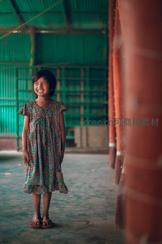 一个穿着彩色碎花裙的小女孩站在简朴的乡村房屋内,阳光洒在她脸上,笑容灿烂,传递出无忧无虑的童年幸福感。