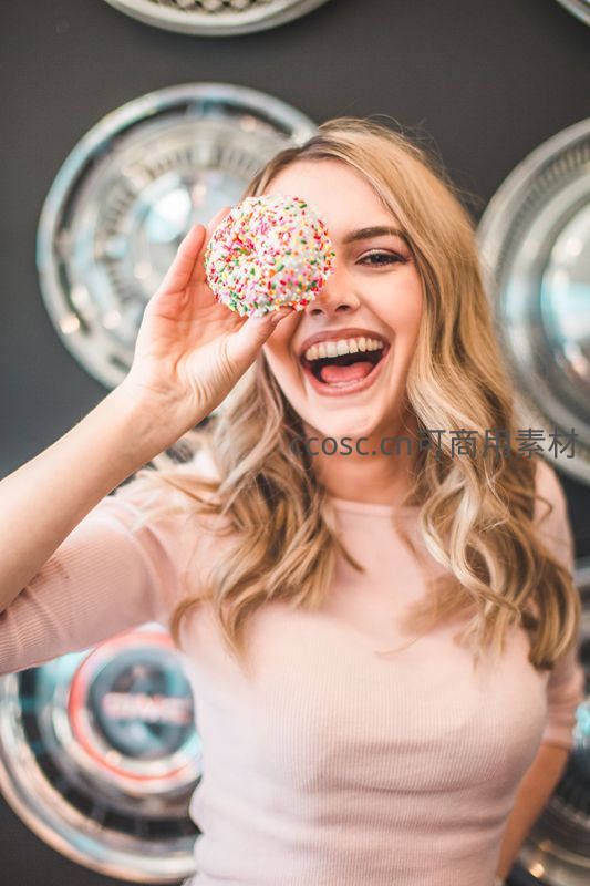 金发女子手持彩色糖霜甜甜圈遮住一只眼睛,开怀大笑,背景是复古汽车轮毂,营造出轻松愉快的美食氛围。