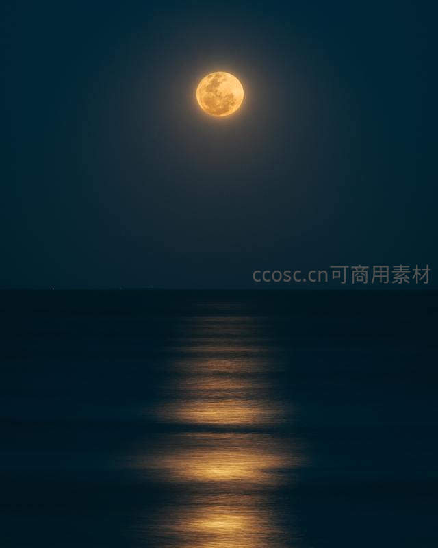 一轮金黄色的满月高挂夜空,其光芒在平静如镜的海面上拉出一道长长的倒影,营造出宁静、浪漫且充满诗意的夜晚。
