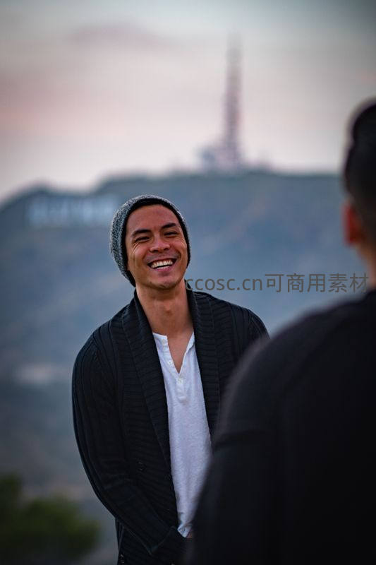 一位戴着针织帽的男子在山丘上开怀大笑,身后是模糊的城市天际线和标志性建筑,氛围轻松愉悦。