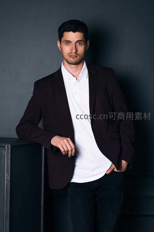 一位穿着深色西装的男士靠在深灰色墙壁旁,姿态放松,神情专注,展现出都市职场人的沉稳与魅力。
