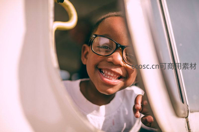 一个戴着眼镜的小男孩从车窗探出头来,露出灿烂的笑容,阳光洒在他脸上,充满童真与旅途中的喜悦。