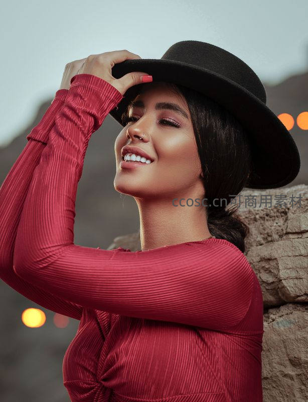 一位穿着红色长袖上衣、戴着黑色礼帽的女子倚靠石墙,手扶帽檐微笑望向远方,背景暖光点缀,尽显优雅与从容。
