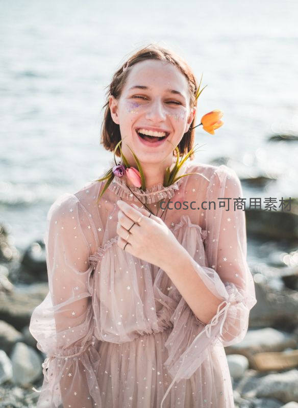 一位身穿星星点点纱裙的女子站在海边岩石上,手持橙色郁金香,脸上带着闪粉,开怀大笑,画面充满梦幻与自然浪漫气息。