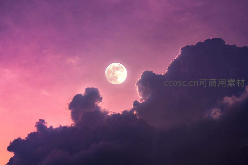 绚丽的紫红色晚霞中,一轮明亮的满月从厚重的云层后探出,光影交错,构成一幅如梦似幻的天空画卷。