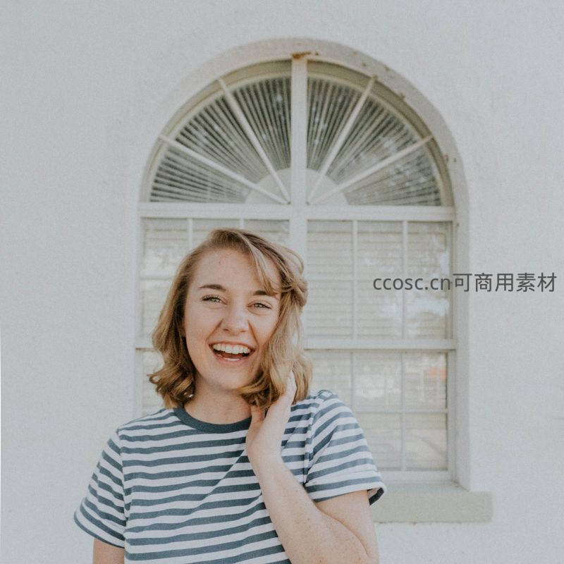 年轻女孩站在白色拱形窗前开怀大笑,身穿蓝白条纹T恤,阳光洒落,充满青春活力与无忧无虑的气息。
