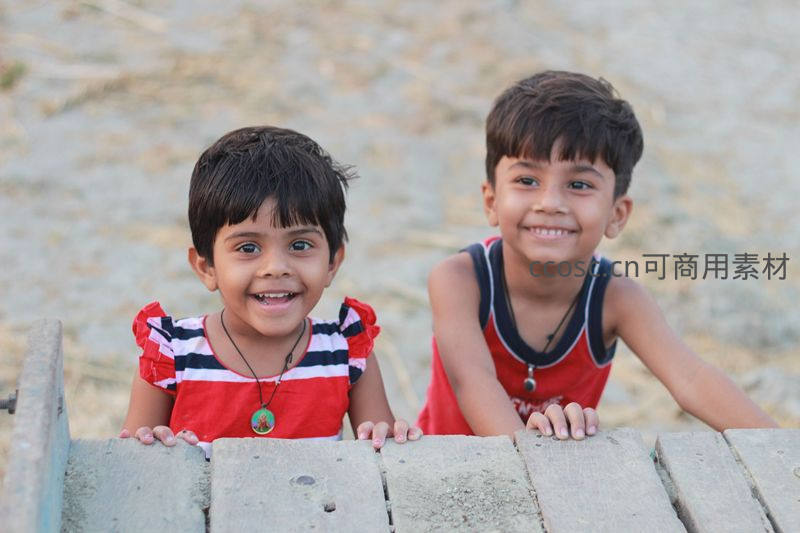 一对兄妹趴在木板上对着镜头微笑,背景是沙地和干草,阳光柔和温暖,画面充满童真欢乐,记录了兄妹间亲密无间的美好瞬间。