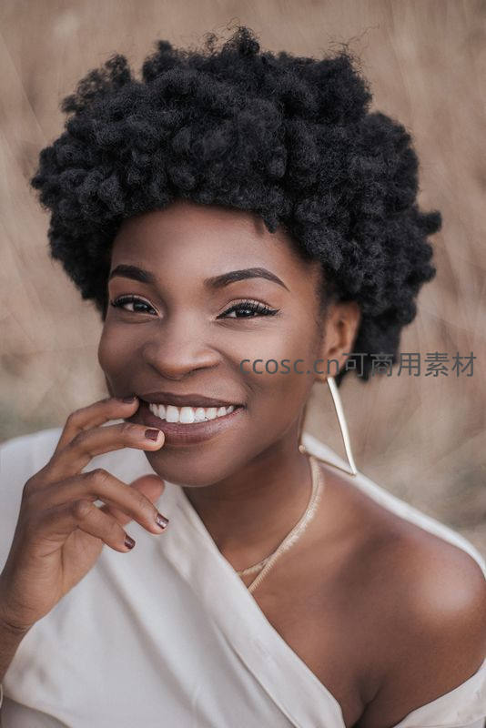 一位拥有蓬松黑色卷发的女性在柔和的自然光下微笑,手轻触脸颊,展现出自信与优雅的气质。